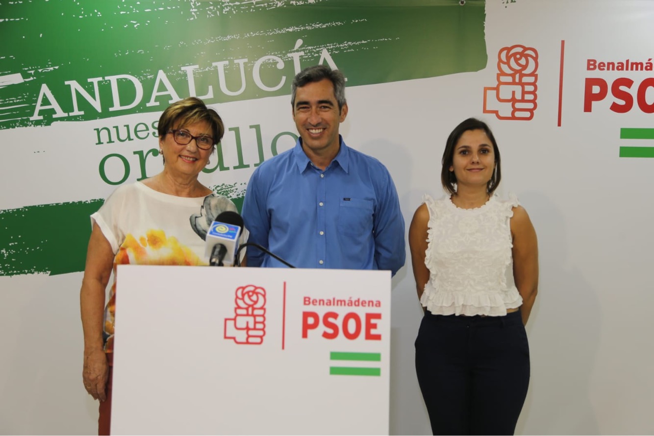 La parlamentaria andaluza del PSOE, Marisa Bustinduy; la secretaria de Organización de los socialistas benalmadenses, María Isabel Ruiz; y el secretario general del PSOE local y alcalde de Benalmádena, Víctor Navas, han ofrecido esta mañana una rueda de prensa para informar sobre los recién aprobados planes de empleo impulsados desde la Junta de Andalucía.